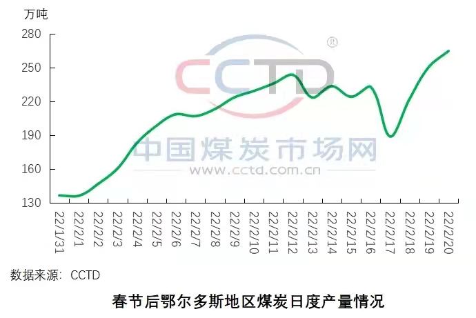 產(chǎn)地煤炭供應(yīng)穩(wěn)步增加。近期,產(chǎn)地煤礦復(fù)工復(fù)產(chǎn)進(jìn)程加快,在產(chǎn)煤礦產(chǎn)量逐步增加,根據(jù)CCTD中國煤炭市場(chǎng)網(wǎng)監(jiān)測(cè)的數(shù)據(jù)顯示,截至目前,鄂爾多斯地區(qū)在產(chǎn)煤礦數(shù)量已提升至225座,較春節(jié)期間增加42座,區(qū)域內(nèi)煤炭日產(chǎn)量已超過260萬噸/日,較春節(jié)期間最低點(diǎn)增長(zhǎng)超90%。