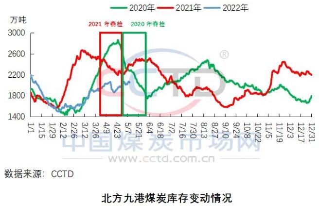 近期北港庫存持續(xù)累積??v觀過去兩年,大秦線春檢期間,北港庫存均呈現(xiàn)下降態(tài)勢,而今年檢修前期,港口庫存不降反升,具體來看,雖然5月1日開始,大秦線進行為期20天的春季檢修,影響港口調(diào)入量20-30萬噸/日,但近期呼局批車量高位穩(wěn)定,且在下游觀望情緒主導(dǎo)影響下,港口調(diào)出量亦不樂觀。根據(jù)CCTD中國煤炭市場網(wǎng)監(jiān)測的數(shù)據(jù)顯示,截至5月9日,北方九港煤炭庫存為2054萬噸,較4月30日(檢修前)增加18萬噸。