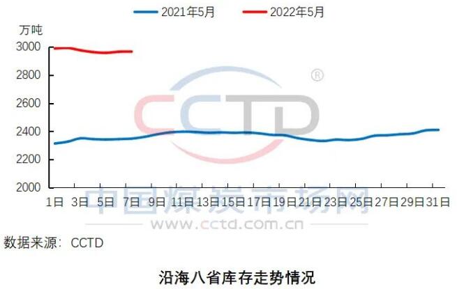 近期終端庫存居于高位。近期,沿海終端日耗偏弱運行,庫存有所下降,但仍處高位。根據(jù)CCTD中國煤炭市場網(wǎng)監(jiān)測的數(shù)據(jù)顯示,截至5月7日,沿海八省煤炭庫存維持在2966萬噸,較去年同期增加600多萬噸。