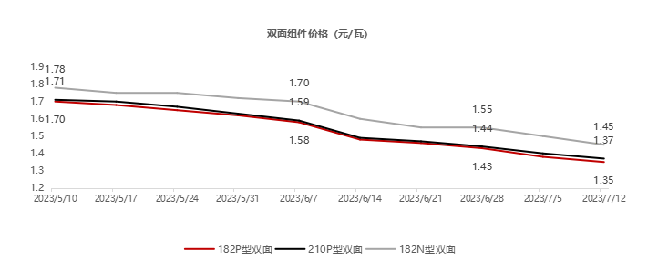 2023年上半年,光伏產業(yè)鏈各主材環(huán)節(jié)價格均呈大幅下跌趨勢,從上游向下游(硅料-硅片-組件)的降幅依次均有遞減。據(jù)PV InfoLink數(shù)據(jù)顯示,以182雙面PERC組件價格為例,從5月初的1.7元/瓦跌至近期的1.35元/瓦。