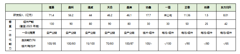 長期高強度的研發(fā)投入是科研實力長期引領的良性循環(huán)指標。據(jù)上半年中標規(guī)模TOP10企業(yè)2022年年報數(shù)據(jù)所示,企業(yè)年研發(fā)投入占營收的比例均約為5.44%,而排名TOP5的企業(yè)已與第二梯隊形成代際差。由于龍頭企業(yè)具備成本優(yōu)勢、資源優(yōu)勢和整合優(yōu)勢,相較于行業(yè)內其它企業(yè)更具競爭力。對于技術研發(fā)和擴產的強勢布局,是龍頭企業(yè)戰(zhàn)略性的判斷和對技術領先的自信,亦是龍頭企業(yè)未來應對產業(yè)爆發(fā)的交付儲備,垂直一體化自供能力達到80%的企業(yè)則具有更好的交付保障能力。
