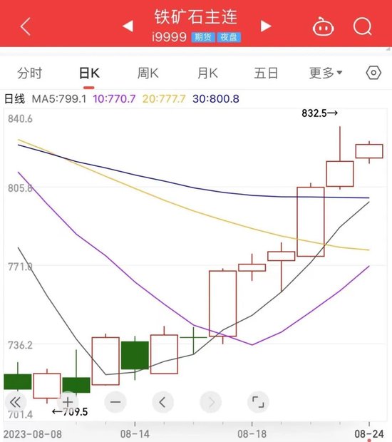 8月上旬至今,現(xiàn)貨端普氏62%Fe指數(shù)從103.35美元/噸上漲至113.3美元/噸,累計漲幅為9.6%。與此同時,鐵礦石期貨也出現(xiàn)不同程度的上漲。昨日午盤收盤,黑色系表現(xiàn)強勢,鐵礦石連漲5日,收漲3.68%。